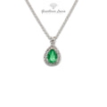 Collana in oro bianco 18 kt con smeraldo naturale taglio goccia ct: 0,50, contornato da diamanti taglio brillante ct: 0,20, colore F, purezza VS1.
