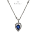 Collana in oro bianco 18 kt con zaffiro naturale taglio goccia ct: 1,34, contornato da diamanti taglio brillante ct: 0,58, colore F, purezza SI1.