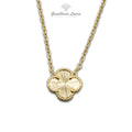 Collana con ciondolo a forma di quadrifoglio in oro giallo 18 kt guilloché. Il peso dell’oro è di g 3,90.