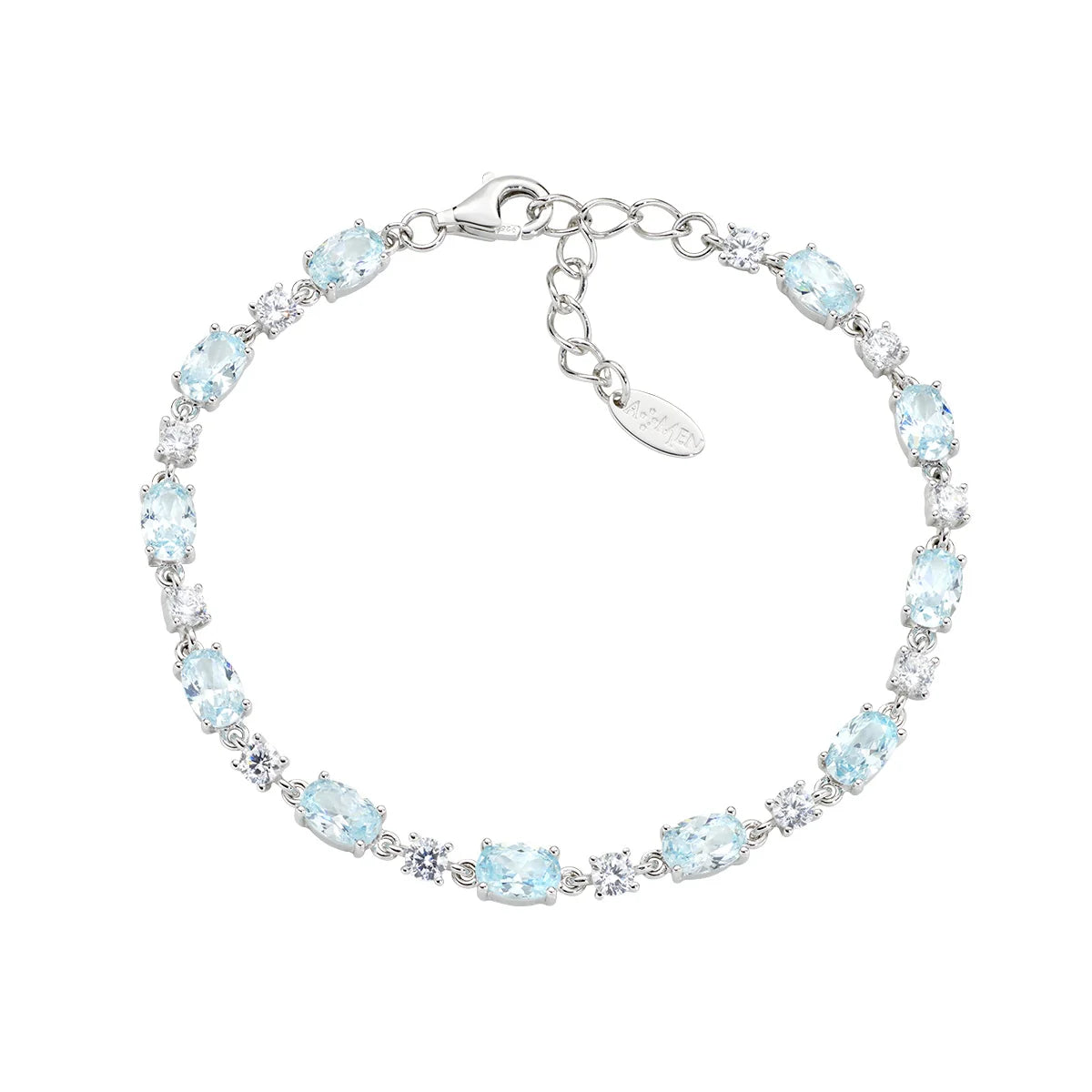 Bracciale in argento 925 rodiato con zirconi acquamarina e bianchi. Lunghezza regolabile da 16 a 19 cm con catena di allungo e chiusura a moschettone. In questo elegante bracciale gli zirconi acquamarina taglio ovale da 6 mm si alternano a zirconi bianchi tondi da 3 mm, per omaggiare i tuoi colori e la tua luce più bella.