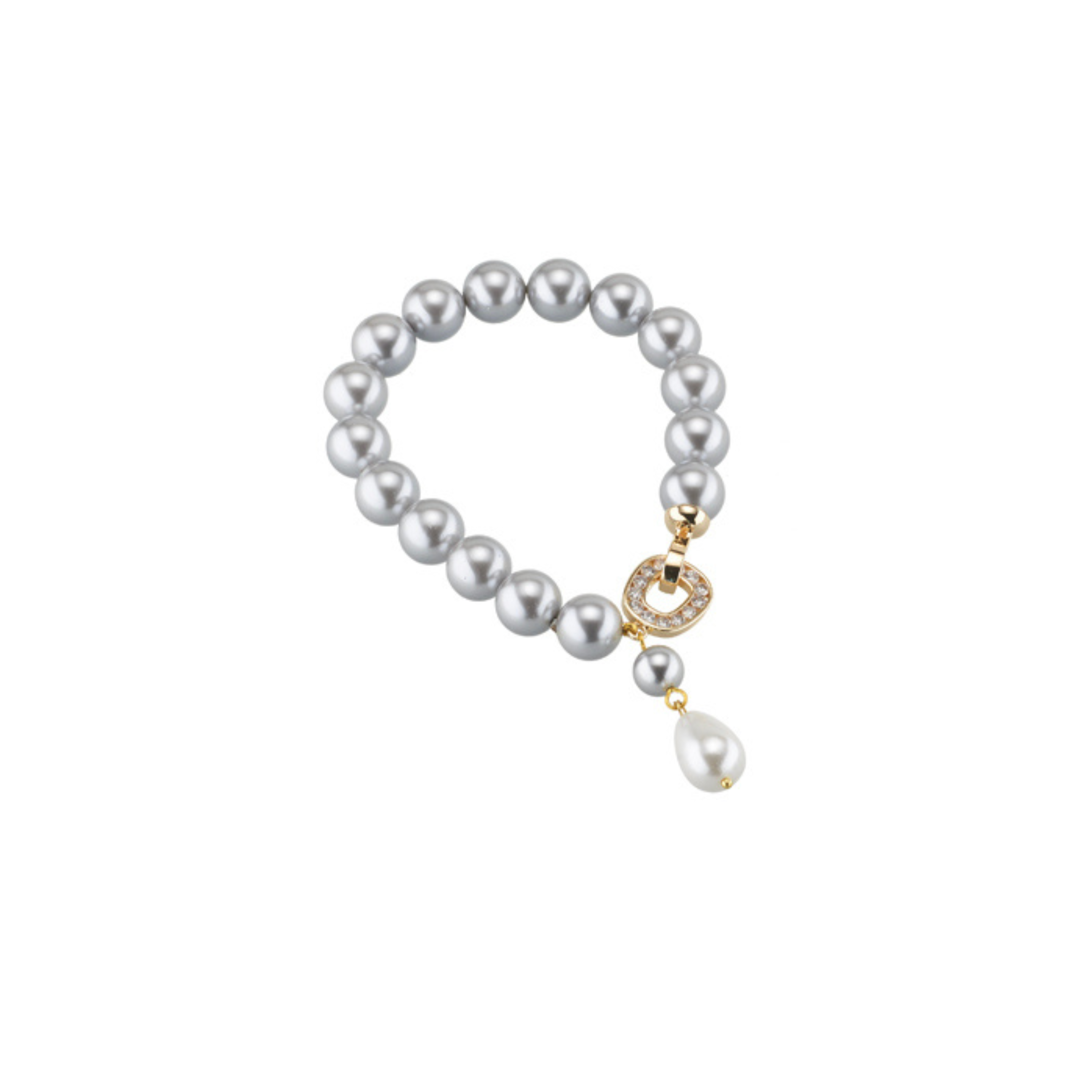 Bracciale in ottone, finitura oro con perla di maiorca grigie e bianche e zirconi. (19cm.)