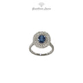 Anello in oro bianco 18 kt con zaffiro naturale taglio ovale ct: 1,46, contornato da due file di diamanti. Acquistando il prodotto, è possibile personalizzarlo gratuitamente in base alla misura del vostro dito.