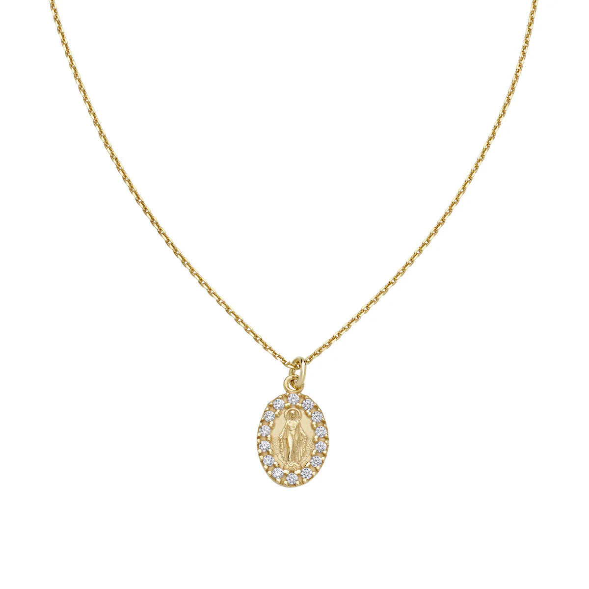 Collana in argento 925 dorato con medaglietta Madonna Miracolosa bordata di zirconi bianchi. La medaglia è lunga 1,1 cm, mentre la catena ha lunghezza regolabile da 40 a 45 cm con allungo e chiusura a moschettone.