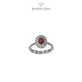 nello in oro bianco 18 kt con rubino naturale taglio ovale ct: 0,52, contornato da diamanti taglio brillante ct: 0,30, colore F, purezza SI1.