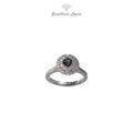 Anello in oro bianco 18 kt con smeraldo naturale taglio tondo ct: 0,33, contornato da due giri di diamanti taglio brillante ct: 0,54, colore G, purezza SI.