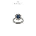 Anello in oro bianco 18 kt con zaffiro naturale taglio ovale ct: 1,52, contornato da diamanti taglio brillante ct: 0,77, colore F, purezza VS1.