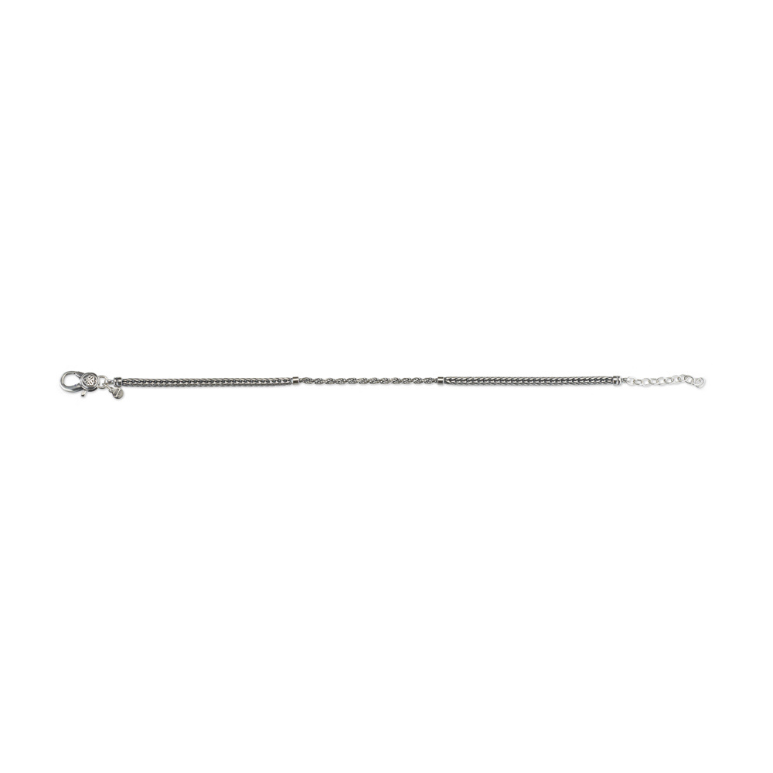 Bracciale in ottone finitura rodio e zirconi con perle di maiorca nere. (16+4 cm).