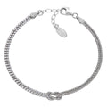Bracciale in argento 925 rodiato con due catene unite a formare un nodo centrale. Una delle catene è un tennis con scintillanti zirconi bianchi. Il Bracciale Nodo d'Amore è il simbolo tangibile di ogni legame indissolubile. Celebra l'intreccio unico con la tua persona del cuore e raccontalo scegliendo il colore che più lo rappresenta!